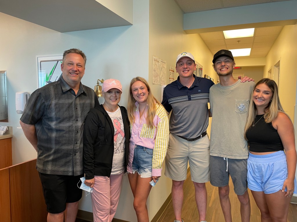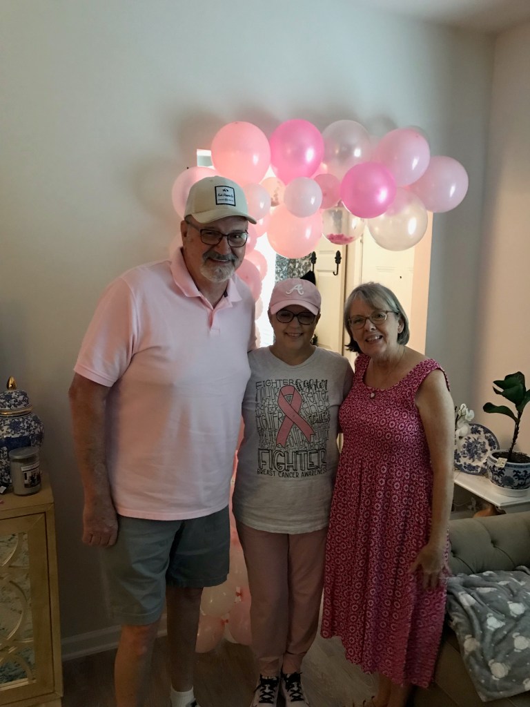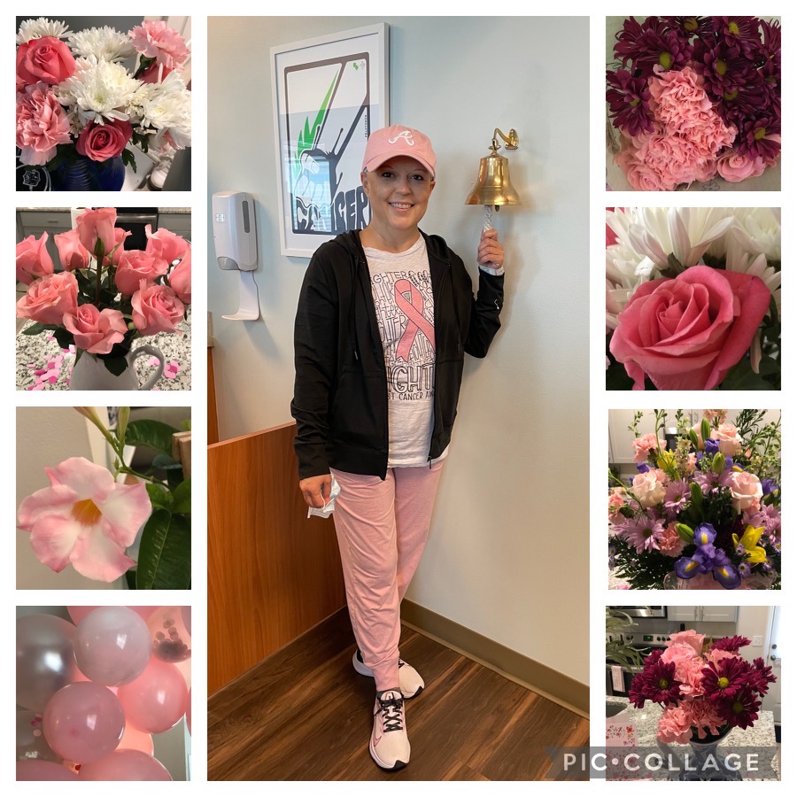 I was able to ring the bell after my treatment. Tim, Emily, Adam, Grayson and Brittney were there to witness it. I did it without crying but it was very emotional. When I got home my parents were there (wearing pink) and my family room at our rental had lots of pink! (Blush and Bashful – like in Steel Magnolias๐Ÿ˜Š). Emily made a ballon arch, and I had several bouquets of flowers. Mom brought pink roses, a pink Mandevilla, a pink and white bouquet and a white orchid); Ashlyn sent pink and purple flowers and Crumbl cookies; Mimi and her family sent a beautiful bouquet that included 8 roses – 1 for each treatment I have completed. I wore a T-shirt today that had the pink ribbon and words “fighter” that Emily had given me, my pink joggers, my pink nikes and my pink Atlanta Braves Hat. So there was definitely a pink theme.